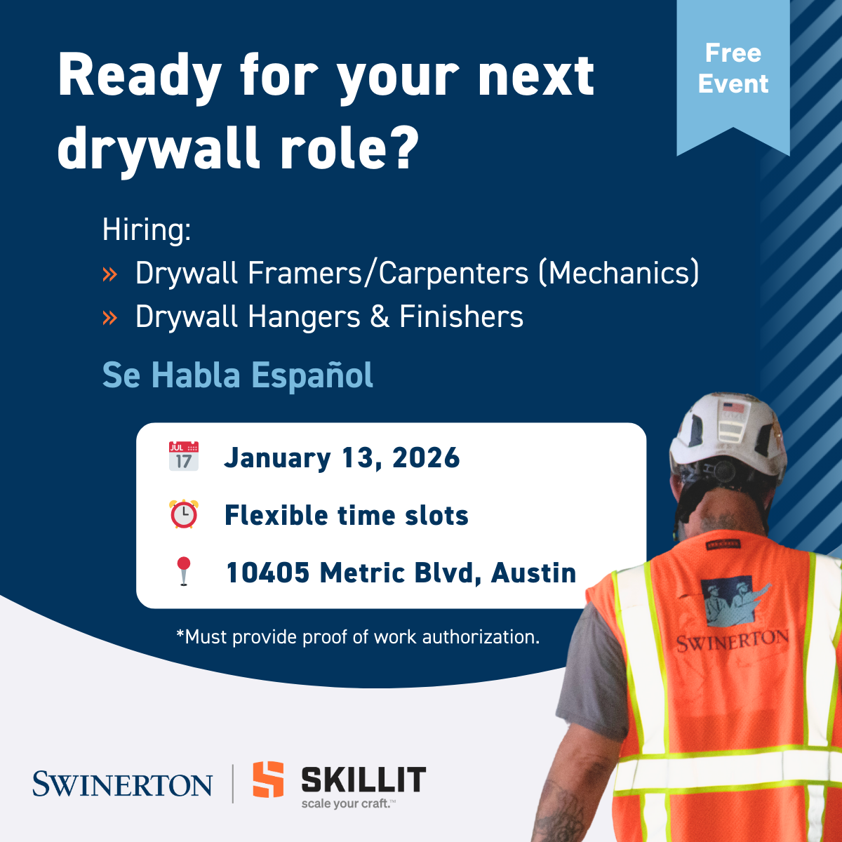 Come down to Swinerton’s training facility in Austin on Tuesday, January 13, 2026 to interview for multiple open positions for drywall framers/mechanics, as well as hangers and finishers. Must have a Skillit profile to be considered. Start your profile by filling out the form below.